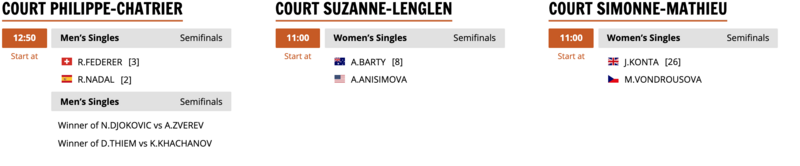 Men are playing both SF on PC. Women are playing on SL and SM.Hopefully the WTA matches are done and dusted within an hour tomorrow. Couldn't care less about the winners when you got 2 big matches coming after.