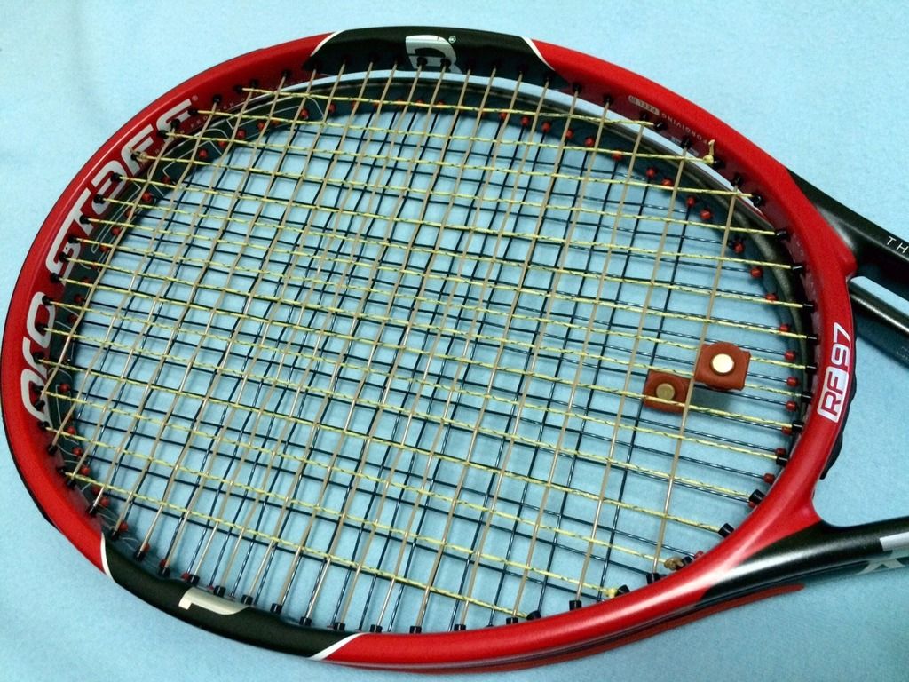 RF97 - in my signature, basically 371g (strung with overgrip - weight added in the handle and at 12:00 under grommet) - Wilson Natural Gut 24kg/4g 22.5 kg