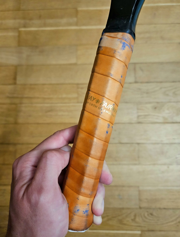 As our hero was used to play with Wilson handle, his racquets were equipped with Wilson like molded handle, and even a butt cap was from Wilson, but for sure W logo were deleted from his racquets.