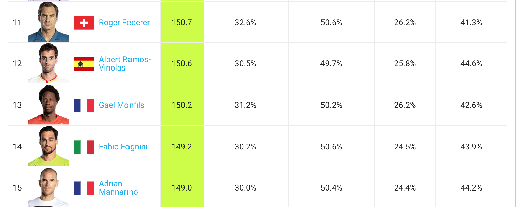 | Roger Federer | 51.72% | 53.86% | 36.89% | 16.97% |